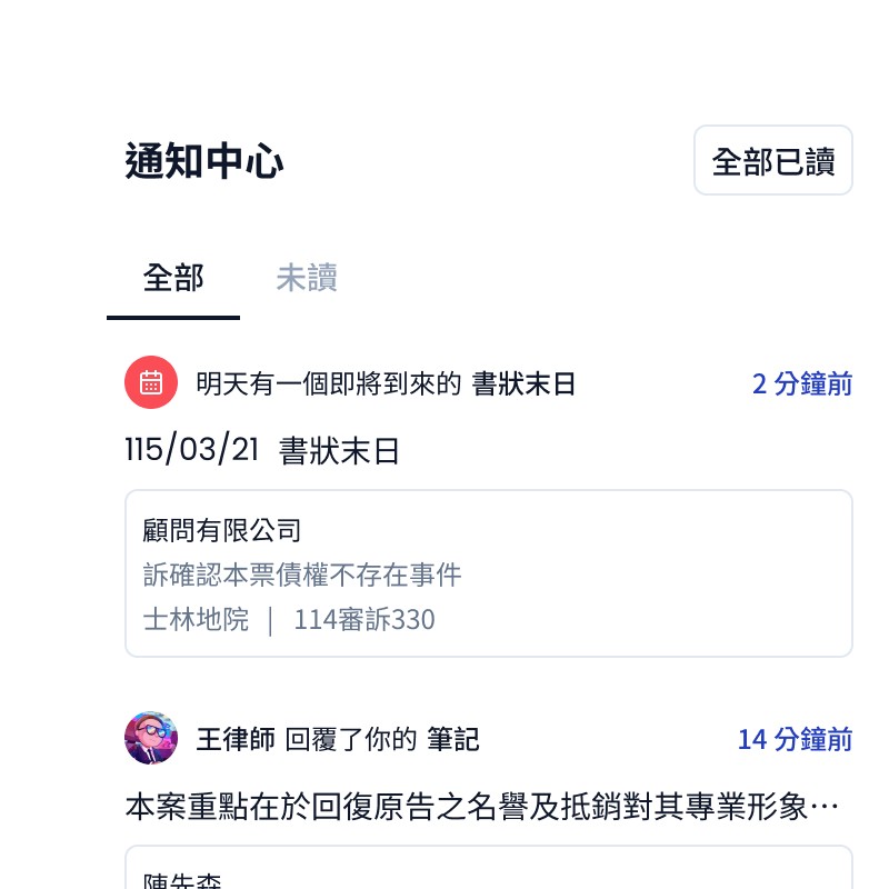 助理收文後立刻上傳系統並連動案件,律師手機馬上收到通知。